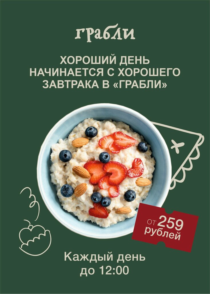 Не считанное число раз проходила мимо ресторана"Грабли"на Пятницкой,зашли первый раз сегодня. Заведение"фри-фло", самообслуживание отличная концепция, для меня правда рестораном это заведение назвать трудно. Впечатлил неожиданно большой выбор блюд: салаты, горячее, напитки, пирожные... Пирожные встречают прям у входа и соблазняют просто жуть! )) Но впереди ещё много всего!)) Выбираешь, набираешь и идешь на кассу. Достойно по вкусу,неплохие цены, хороший, приветливый персонал. Огромный минус- сели в летнике, а там голуби летают над головами посетителей, кучкуются на столах, клюют то, что остаётся в тарелках... При нас грязную посуду старались убирать быстро, но это особо не спасает. На этот факт руководству стоило бы обратить внимание и принять меры. Зайдем ещё раз,может дополню отзыв, но пока 5 баллов.