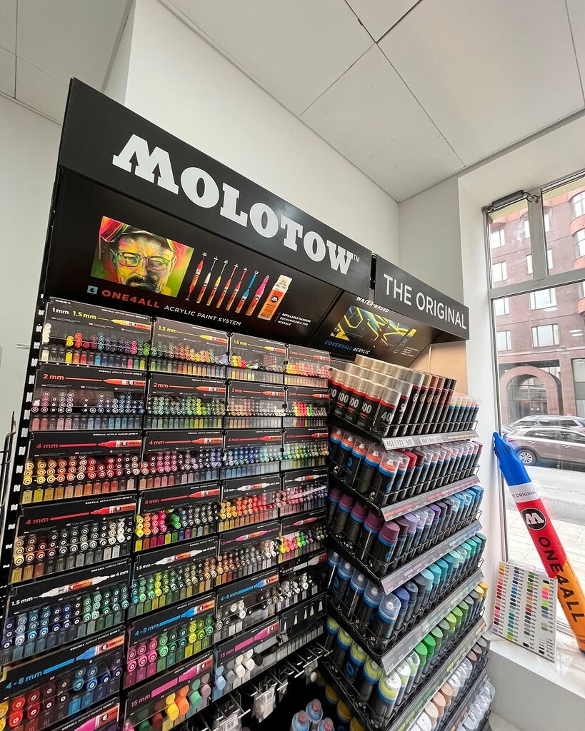 Часто заглядываю сюда. Ассортимент красок большой, от дешёвых, до премиальных красок, самые разные маркеры, линеры, так-же скетч буки. Часто проходят акции и скидки. Так-же можно найти литературу на тему уличного искусства. Приятный продавец, если есть вопросы, подскажет и посоветует, что лучше использовать в том или ином случае.