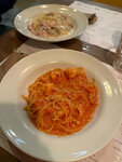 Захотелось пасты и решили посетить данное место, потому что по отзывам стоит 5 звезд. В самом заведении вроде бы и уютно, но стулья неудобные, как на фудкорте. Официантов нет, вы сами заказываете блюда на кассе. Пробовали только пасту… будто бы и разнообразие названий паст.. но на выбор только пенне (перья) и спагетти, что не очень радует. На вкус, конечно, не Италия, а обычное домашнее блюдо. Спагетти с кальмарами и креветками: всего 3 креветочки, много томатного соуса, на вкус ОЧЕНЬ-ОЧЕНЬ сладкого. К сожалению, мало сыра…