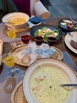 В целом, уютный ресторан. Заехали пообедать. Взяли комплекс и по основному меню финскую уху с креветками, гребешок, ежа, десерт "Тюря" и таёжный чай. Последний не понравился. Подается не в прозрачном, а в керамическом чайнике с заварочным пакетом внутри. У него странный вкус. В других заведениях сети чай с таким же названием в разы лучше. Десерт удивил - внутри мороженое с вареньем, сверху попкорн и какие-то лепестки))) Но, было вкусно. В меню тактильно приятная качественная полиграфия. Приятная женщина работает в гардеробе. Столик бронировала по телефону, попросила с красивым видом. Посадили у окошка, но, почему-то предварительно уточнили перед посадкой будем ли мы заказывать бизнес-ланч или по основному меню... Людей было немного. Нам всё быстро вынесли и рассчитали. Спасибо! Заедем ещё 👍
