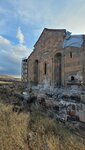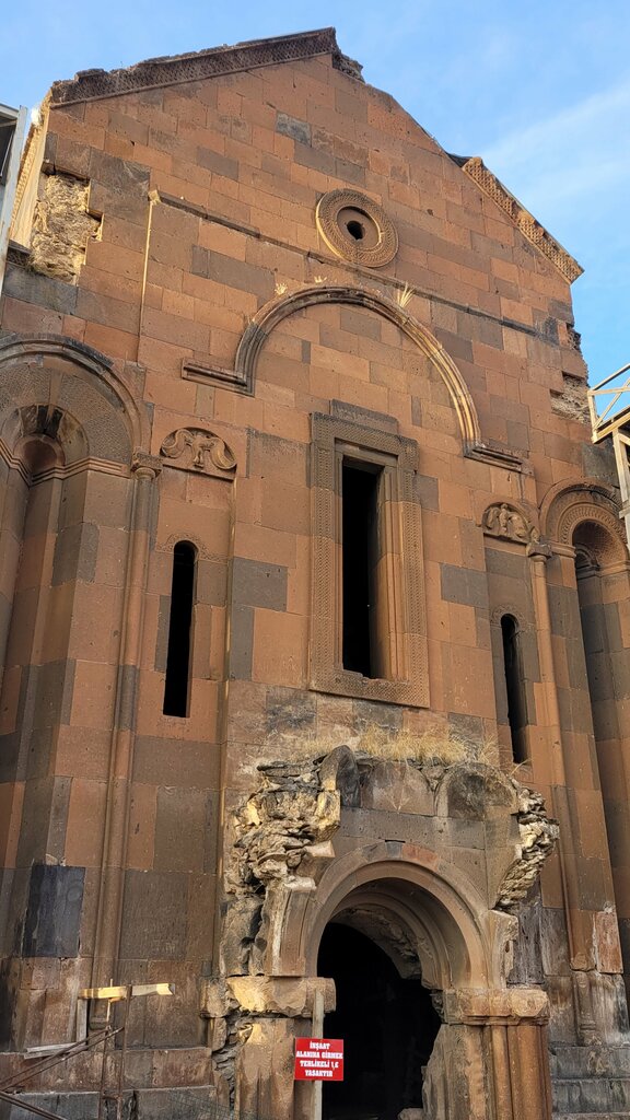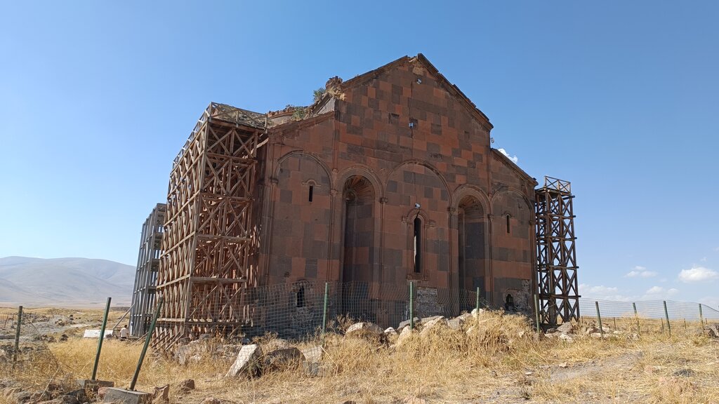 The Cathedral of Ani. It was built in 1001/1010 by the wife of Tsar Gagik. The walls are in good condition, there is no dome, instead there is a hole. There is complete devastation inside. There are scaffolding, apparently for restoration work.