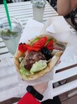 Гирос с говяжьей котлетой Плюсы: Заказ сделали быстро, т.к было мало людей Котлеты вкусные, сочные, свежая зелень Минусы: Для любителей чисто и аккуратно покушать гирос не подойдет, из за сочности котлеты и овощей все вытекает. Ну и просили с картошкой фри гирос но приготовили без неё, так что проверяйте В остальном все хорошо, тарелку, приборы и салфетки можно попросить отдельно.