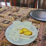 Скромный интерьер. Еда вкусная. Комплимент от заведения в качестве двух рюмок чачи.