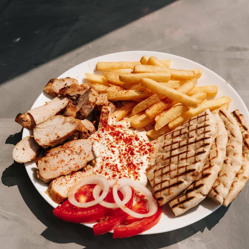 Это сытное блюдо, которое подойдёт для обеда или ужина. Хрустящая обжаренная картошка фри, сочный помидор и свежий огурец в сочетании с куриным мясом на углях и нежным соусом создают богатый вкус. Румяная греческая пита добавляет блюду изюминку