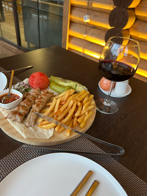 Хороший большой ресторан Проводят банкеты Расширяют территорию, будет 2 новых зала Меню обширное Много мяса, рыбы, закусок Брала кебаб из говядины, овощи на гриле, картошку фри, тарт с ягодами и домашнее вино Все очень вкусное Кебаб нежный, картошка не масляная и тарт похож на тирольский пирог, свежий с ягодами в желе сверху 😍 Домашнее вино 1200 драм, хорошее, не много терпкое домашнее вино Налили такое ощущение мл 250, очень солидный бокальчик Советую🏔️