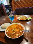 Вкусная еда, большие порции, очень вкусный авторский чай. Немного официантка быть по увереннее в себе и будет ещё лучше! Зимой около окон сидеть холодновато. Но чай и остренькая еда нас согрела))))
