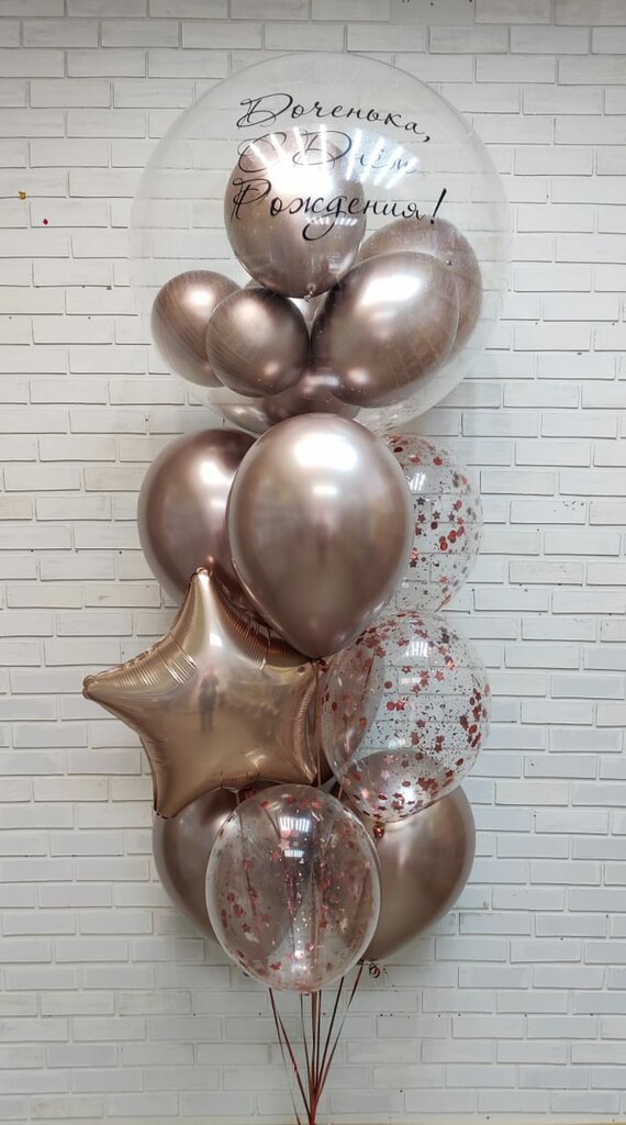 Шар фольгированный фигурный — 1 шт. Шар фольгированный стандарт с индивидуальной надписью — 1 шт. Шар фольгированный стандарт — 1 шт. Шар латексный с конфетти — 2 шт. Шар латексный хром — 4 шт. Шар латексный стандарт — 2 шт.