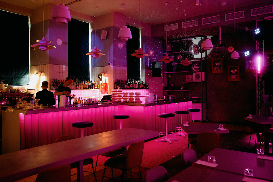 Коктейльный бар с регулярными шумными вечеринками в ярких розово-жёлтых интерьерах. В нижнем баре мешают классические, а наверху — сложные авторские коктейли.