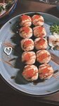 Тёплый ролл с начинкой из лосося в соусе терияки и сыра, запечённый с креветками и моцареллой, под соусами спайси и унаги