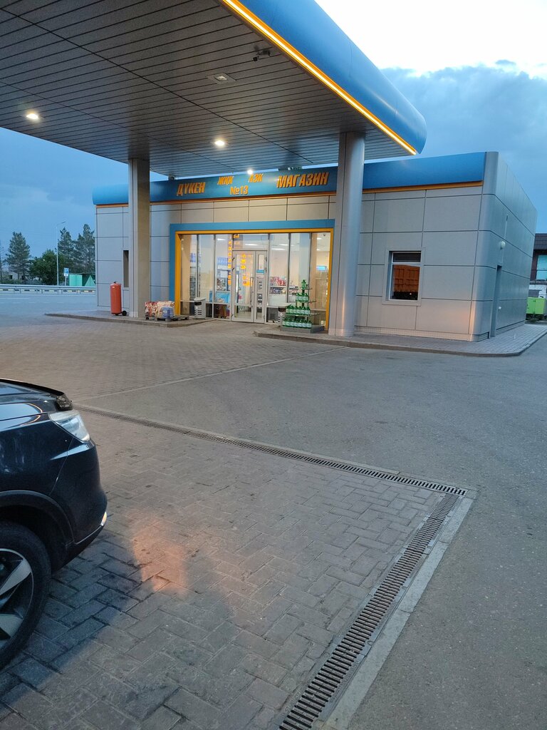 The gas station is located next to kenzhekol. The blue and white gas station and the sun logo, as indicated by the name "helios". They sell products such as samsa, sausages in dough, etc. The gas station is clean, and the interior is nice inside.