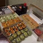 Variety of food:sushi and rolls, sweets, pizza, fixed meal, home cooking