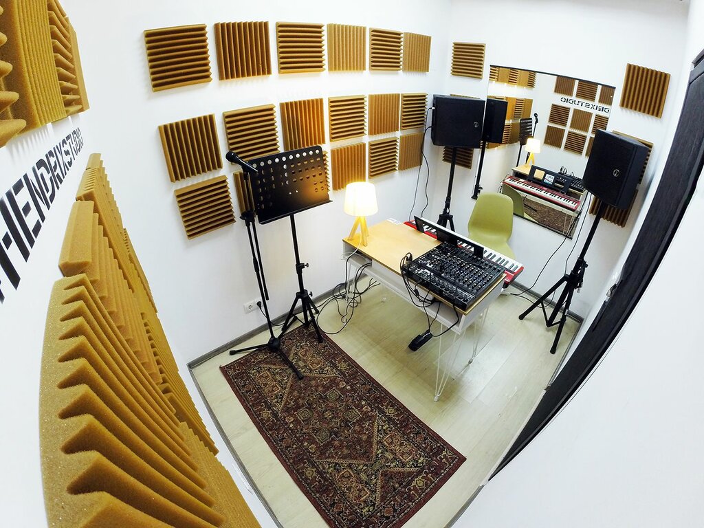 Приятные мини студии для занятий на два человека, оборудование, микровфон,колонки, пульт. Клавиатура, пюпитр, вешалки, суда два и зеркало есть. Для занятий вокалом отлично. Персонал всегда внимателен и приветлив, помогают с настройкой аппаратуры. Есть вай-фай. Помещение без окон, подвальное. Все стены в паралоне и двери, звукоизоляция есть, но иногда слышно рядом звуки