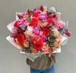 Изысканная композиция из сочетания двух видов роз - французских и пионовидных. Французские розы, с их изящными бутонами и элегантными лепестками, окутывают своим ароматом и придают композиции утонченность и аристократизм.