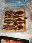 Везут 2 часа 10 минут, онигири курица один рис, плотная твердая панировка , ролл авторский Филадельфия просто не приятный и не вкусный, в описании указан лосось гриль, для человека это рыба в гриль печи запеченная порезанная сверху, нам приехала сырая не первой свежести рыба , не очень похожа на лосось , сверху подверненная зажигалкой, по вкусу слизь с запахом не приятной рыбы, сырое, со вкусом газовой зажигалки и химии, сняли рыбу, ролл пропитался этим запахом, пришлось выбросить. Фото прикладываю
