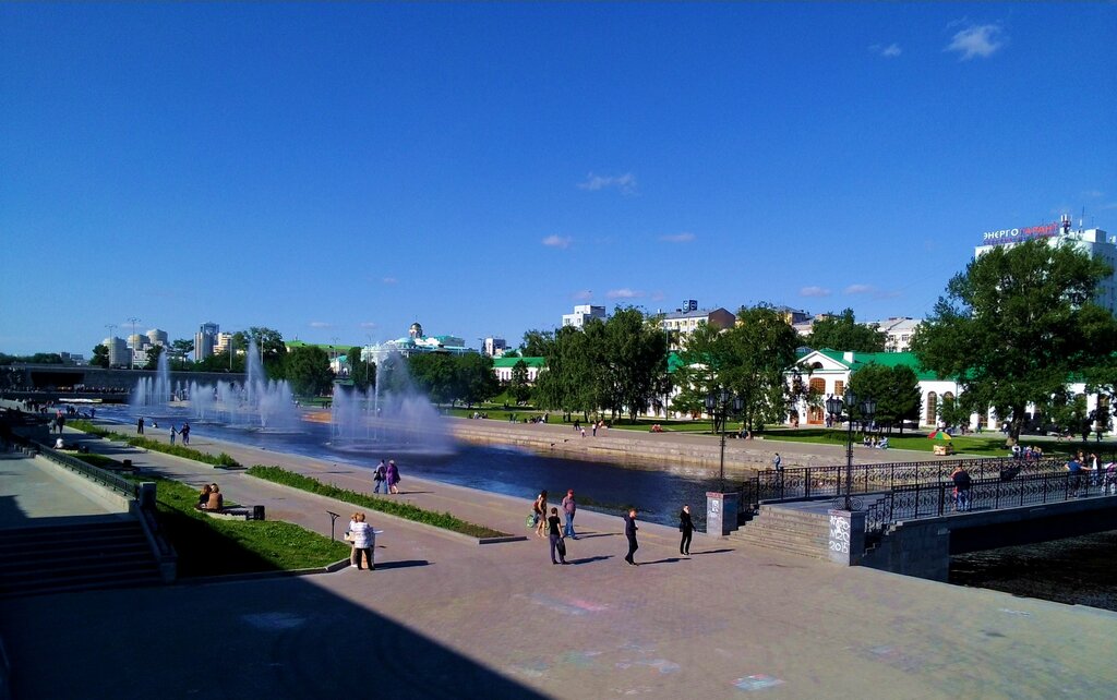 Интересное и живописное место. Три музея в исторических зданиях, старинный Каменный мост, мост Влюблённых, Плотинка, река Исеть с фонтанами, ну и рыбаки, конечно.