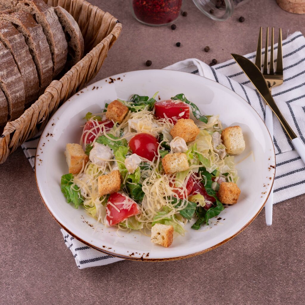 Порция 200 г. Состав: филе куриное, салат Айсберг, помидоры черри, сыр пармезан, майонез, горчица, чеснок, соус соевый, сухарики, специи, салат Романо. Производитель: Ооо Алко-Профи Срок годности: 24 часа