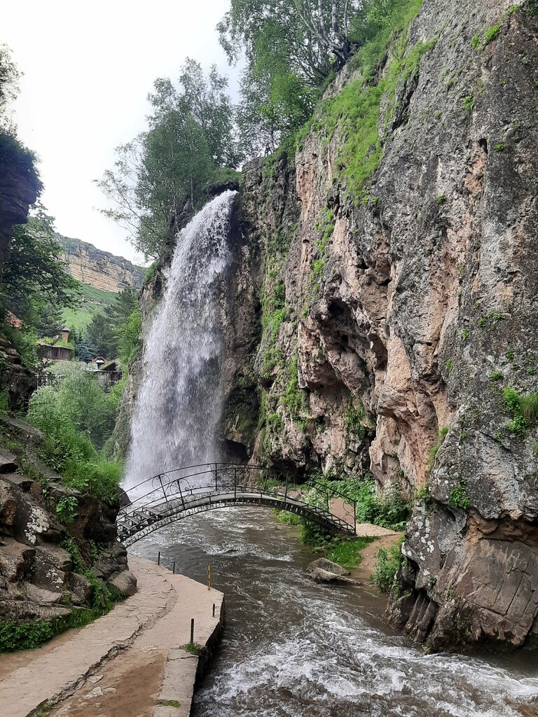 Само место красивое, но летом, видимо, сюда лучше не ездить. Толпы народа даже в будний день. Парковка платная - 200 руб., вход на водопады тоже платный - 200 руб. с взрослого, 100 руб. с ребенка. Атмосфера рынка: куча ларьков, фото с орлами, сомнительные кафе. Лесенки к водопадам и к скалам не очень удобные, узкие, дочка оступилась, больно ударила ногу о камни, какая-то тётка еще на нее и наорала, мол под ноги надо смотреть. На дорожках приходилось протискиваться через людей. Местные преприниматели еще и лошадь притащили прямо к водопаду (для фото верхом и в папахе), перегородили половину и без того узкого прохода. В общем, в шалман какой-то превратили территорию.