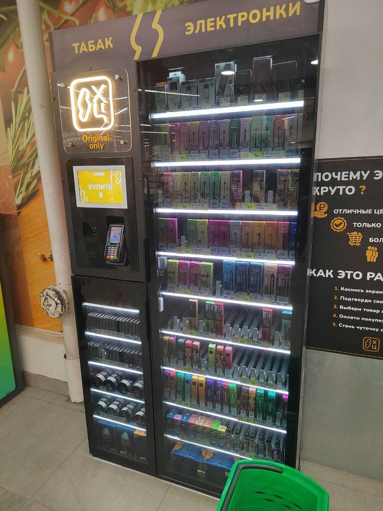 Очень необычно, впервые такое встречаю, прикольный формат. Понравилось что полки расположены прям перед тобой и не надо наклоняться под кассу и высматривать курилки. Рядом стоял очень милый молодой человек, все объяснил и показал как пользоваться, но если его нет , то можно и охранника спросить и кассиров , проверить возраст и открыть аппарат.