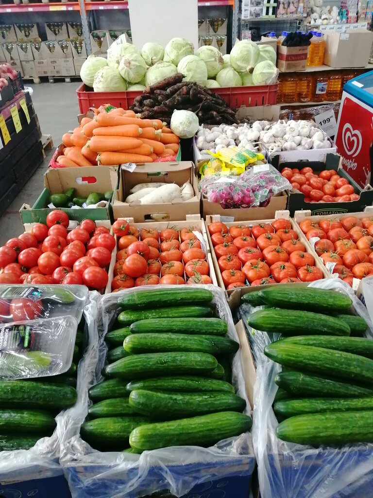 В магазине есть всё. Интересовался фруктами. Очень вкусные , крупные киви. Гранат большой , но не спелый, не "щелкает". Дешёвые яблоки с жёлтой этикеткой не вкусные. В холодильнике вкусные свежие тортики.