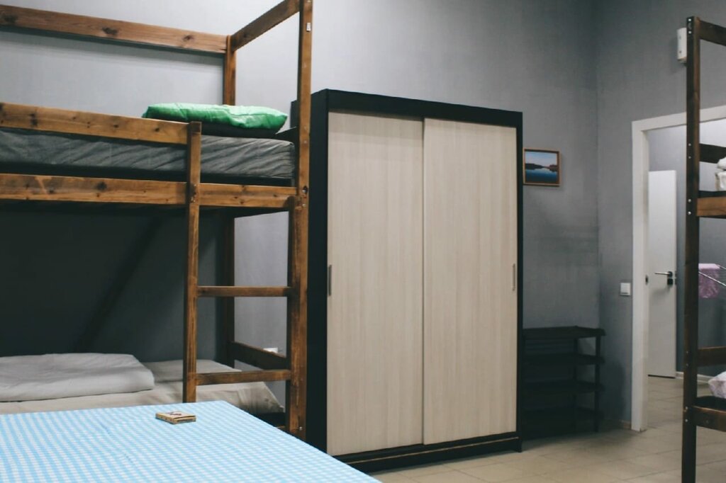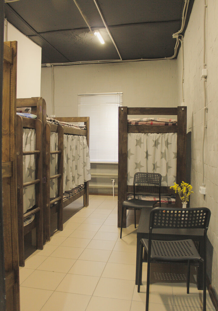 2 комнаты с 2х ярусными кроватями, большая кухня, 2 стола, около одного стола 2 диванчика, 2 газовые плиты, 2 холодильника, 2 стиралки. Нормальный бюджетный хостел