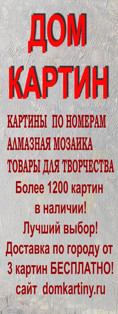 вход в сам дом картин находится в зале где продаётся одежда, как заходите, сразу от двери на лево))) но можно и у продавца одежды спросить. выбор картин огромный, лучше определиться на их сайте, там и заказ можно сразу оформить. оплата будет при получении. можно оплатить наличной, можно - по банковской карте. мне понравилось, хоть и далеко от моего дома. но туда и обратно доехала на маршрутке 414, дубльгис был мне в помощь. и картина, и краски, и кисти были запакованы в общий полиэтилен и уложены в удобную для переноски коробку с ручкой, практически дипломат из картона😉 рекомендую всем, это лучшее место с картинами по номерам и мозайкой👍👍👍