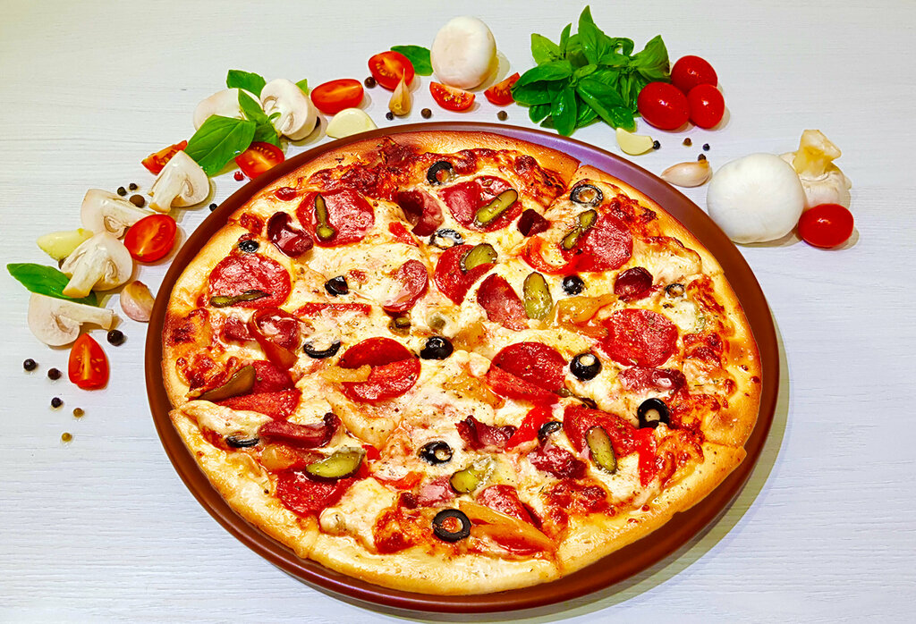 соус томатный, салями, лук красный, перец болгарский, маслины, бекон, орегано, шампиньоны, сыр моцарелла.