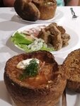 Очень любим это место за вкусное и необычное блюдо - борщ в хлебе. Сегодня немного разочаровались. Суп не такой наваристый, как обычно. И хлеб прямоугольный, вместо круглого. Чесноком одну полосочку мазнули и все.