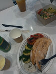 Интересный выбор блюд, цены немаленькие, но если хочется выбрать среди всего фастфуда что-то более здоровое, то наверно это того стоит. Попробовала куриные котлеты с пюре и брусничным соусом. Всё вроде вкусно, но в самих котлетах будто не хватает куриного вкуса. Вроде и волокна мяса видны, и соли достаточно, а вкус и запах пресные. Я бы предположила, что в эти котлеты вместо хлеба (сухарей) добавили что-то вроде перловки, вроде всё плотное, а вкуса мало. Думаю, что полезные куриные котлеты могут быть вкуснее. Очень понравился фруктовый чай (смородина грейпфрут). Сначала огорчилась, что в ассортименте совсем нет кофе, но потом не пожалела. Как бонус дали в подарок протеиновую конфету на основе фиников. Приятный момент. Думаю стоит попробовать другие блюда, рыба у других гостей выглядела очень аппетитно.