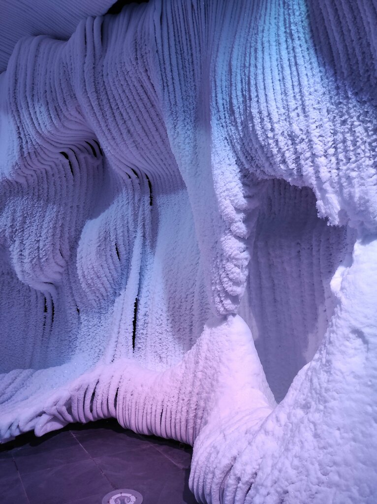«Ледяная пещера» в парке Зарядье оставила далеко не самые приятные впечатления. Задумка вроде бы неплохая, однако исполнение оставляет желать лучшего, как будто кто-то остановился на этапе черновой отделки и решил, что сойдет и так. Сеанс длится 6 минут. Перед входом на «аттракцион» нам выдают каску, как бы намекая на экшОн, и, по желанию, одноразовую шапочку (говорят, что в теплое время года также предлагают приобрести плед). Благо хоть бахилы надевать не заставляют. Далее проходим через шлюзовую камеру в компании хмурого проводника, скучающим голосом рассказывающего о правилах пребывания, и попадаем в пещеру, которая по сути представляет собой большой морозильник. После кратковременного ожидания в темноте начинается светомузыка: под мигающий яркими цветами свет нам проигрывают небольшие отрывки знакомых песен для создания зимней атмосферы. Есть также пара мест, где с потолка сыплется снег, и можно даже слепить пару снежков. Но сделано это очень локально и не вызывает восторга. Аудиогида, каких-либо комментариев, пояснений, кроме краткой инструкции на входе, во время посещения не ждите. Посетители ограничены лишь фотографированием себя внутри ледяных стен «пещеры» и наблюдением за световыми эффектами. При желании можно встать под падающий снег и пофантазировать на тему новогодних праздников. Но желания почему-то не возникает. Также стоит отметить, что всем посетителям на выходе выдается мороженое. И это могло бы стать компенсацией за пережитое разочарование, если бы оно было вкусным. Но увы. Хочется верить, что у пещеры есть потенциал для развития, и когда-нибудь мы увидим нечто законченное и действительно интересное. А пока ставлю 2 Деда Мороза из 5.