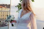 Стильное и современное свадебное платье с открытыми плечами и элегантным V-образным вырезом. Верх платья украшен объемными драпированными складками, которые создают эффект легкости и изысканности. Вышивка и перламутровые детали вокруг выреза добав...