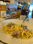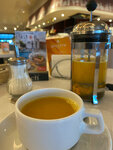 Недавно заглянули в IL Патио перед вылетом — остались очень довольны визитом. Ресторан приятно удивил уровнем сервиса и качеством блюд, что для аэропорта особенно ценно. Начну с кухни: итальянская классика здесь действительно удалась. Пицца «Маргарита» — с тонким тестом и насыщенным вкусом томатов, паста «Карбонара» — в меру сырная, с идеальны выверенным балансом ингредиентов. На десерт взяли тирамису — нежный, не приторный, в лучших традициях. Из напитков порадовал фирменный чай с насыщенным ароматом и освежающий лимонад. В целом меню разнообразное: найдётся что‑то и для ценителей классики, и для тех, кто хочет попробовать что‑то новое. Обслуживание на высоте: официанты внимательные, ненавязчивые, оперативно приняли заказ и несколько раз уточняли, всё ли в порядке. Атмосфера располагает к отдыху: интерьер в тёплых тонах, много зелени, приглушённый свет и фоновая музыка создают ощущение уютного итальянского кафе, а не транзитной зоны. Цены чуть выше городских, но для аэропорта вполне адекватные: средний чек составил около 1000 руб. на человека. В пиковые часы может быть немного шумно из‑за потока пассажиров, но это, пожалуй, единственный нюанс. В итоге IL Патио стал для нас настоящим островком комфорта перед полётом. Однозначно рекомендую тем, кто хочет вкусно перекусить и немного расслабиться в ожидании рейса!