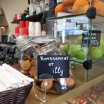 Маленькая уютная кофейня с вкусным кофе, выпечкой и сандвичами. Общительная и симпатичная леди «за баром» :)