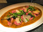 Нежные сливки и сочные кусочки фланка. Лёгкая горчинка рукколы, тонкий аромат лука-шалота. Богатый вкус с нотками горгонзолы и демигласа с эринги. Контраст текстур: хрустящий лук фри, сладость черри и пикантная острота рокфора
