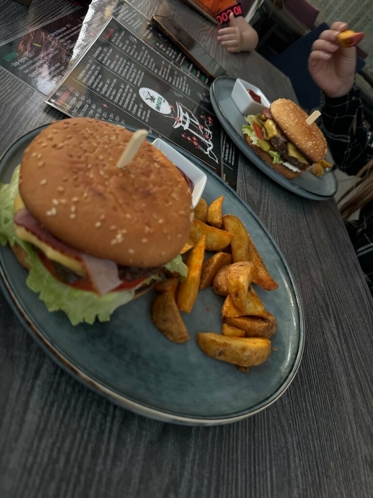 Бургер BBQ (говяжья котлета, соус BBQ, томат, корнишоны, бекон, чеддер), картофельные дольки, кетчуп