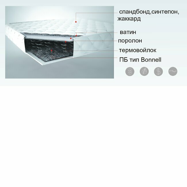 Матрас пружинный на зависимом блоке Боннель. Рекомендуемая нагрузка 80 кг на одно спальное место. Чехол матраца выполнен из синтетического жаккарда.