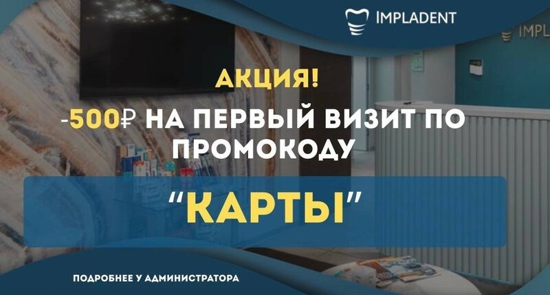 Скидка -500 рублей на первый визит по промокоду «КАРТЫ» в Стоматологии Импладент в Санкт-Петербурге: начните лечение с выгодой! Выбор стома...