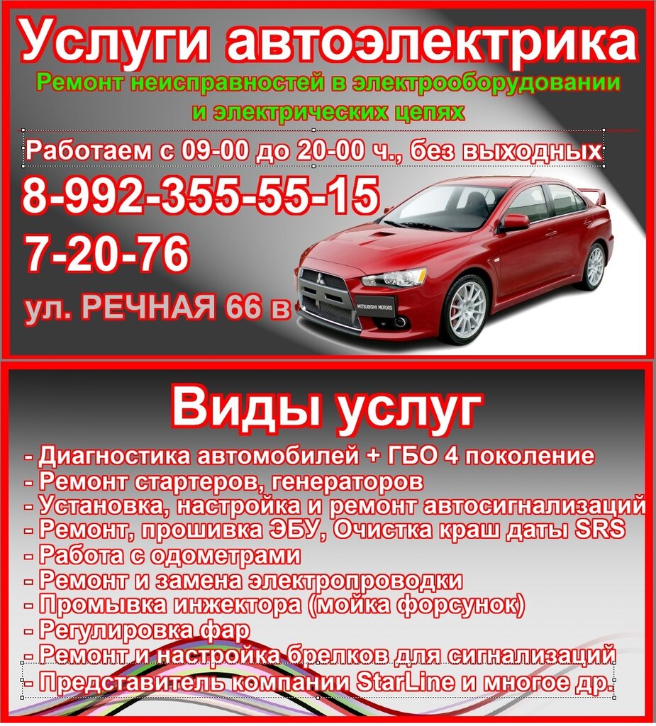 Repair sevices:starter motor repairs, computer car diagnostics, car electrician repair, nozzle cleaning, fuel injector cleaning, car alarm, generator repairs, repair of fuel system, automotive electronics repair, engine endoscopy, installing additional equipment, removal of catalysts