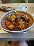 Место очень милое, приятная атмосфера, играет музыка на грузинский мотив. Заказала блюдо, непомню как называется, блюдо состоит из телятины картофеля, овощей (перец болгарский, томат, лук, зелень, приправы. Вкусно, но! Мясо было жестковатым, хотя написано было нежная телятина, но пофакту жесткое и поподались куски с прожилками которое нежуется. В этом рестораны в первый раз, но если буду рядом, зайду еще чтобы чтото другое попробовать
