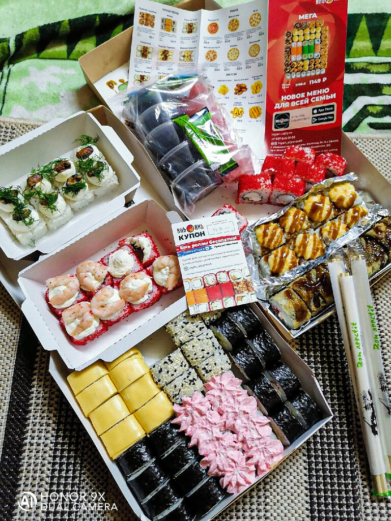 Variety of food:sushi and rolls, sweets, pizza, fixed meal, сhinese food, home cooking