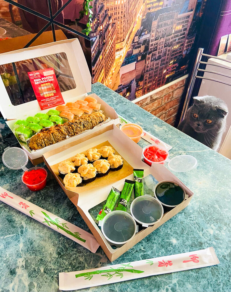 Variety of food:sushi and rolls, sweets, pizza, fixed meal, сhinese food, home cooking
