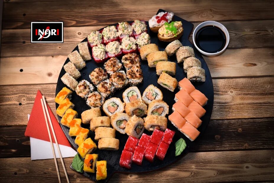 Variety of food:sushi and rolls, pizza, сhinese food