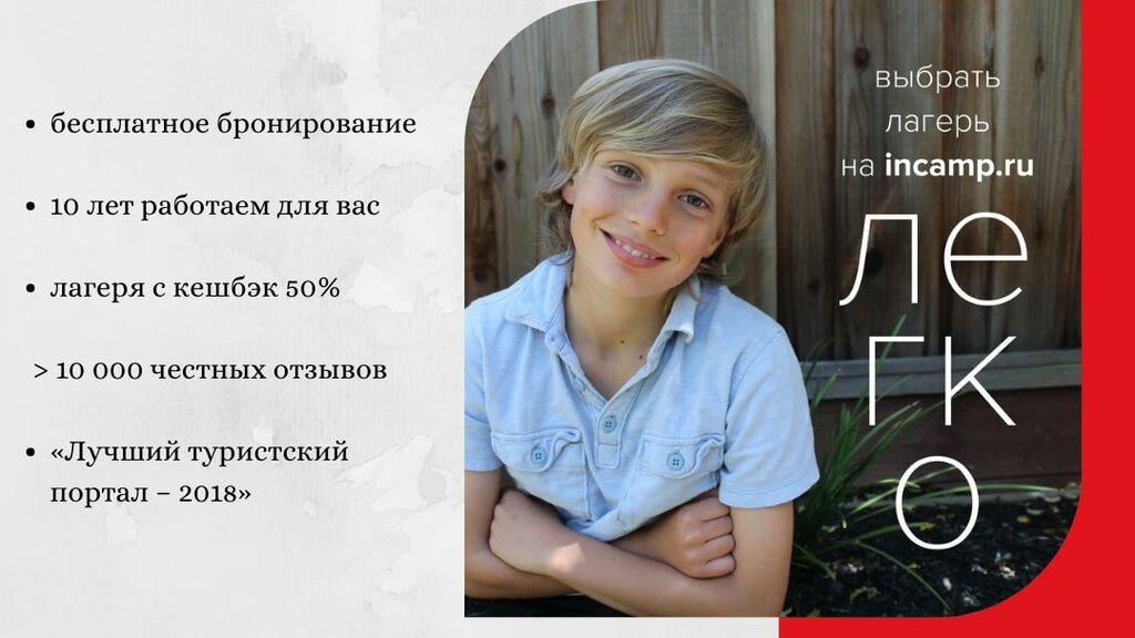 Спасибо сотрудникам Инкамп!!! Только благодаря их рекомендациям, подборке, замене тех, кто не откликнулся на 100%, я решилась отправить ребенка в первый раз в лагерь! Лагерной сменой также осталась довольна я и ребенок!!! Еще раз огромная благодарность Инкамп, что вы есть, что помогаете роодителям сделать созвучный из запросам выбор!