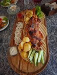 Первое, что зацепило - умение работать с людьми Рафаэля. Именно он нас пригласил в кафе, рассказал о вариантах блюд, стоимости и наличии прекрасных видов из залов. Второе - вкус блюд. Очень нежная ножка барашка, вкуснейшие и необычные салаты. Кухня, действительно, достойна похвал. Вкусные лимонад Щербет и кизиловый компот. Лепешки рекомендую есть сразу горячими, только приготовленными, так как, когда они остывают, становятся жёсткими. Третье - немаловажное - отличный вид на город, в частности, на ханский дворец. О длительном ожидании готовности блюд нас предупредили, так что это не было новостью