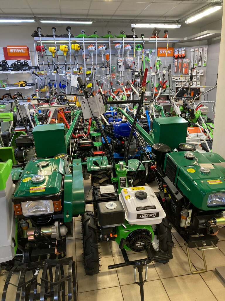 Types of garden equipment:accessories for garden machinery, small tractors, cultivators, waste shredders, blowers, lawn mowers, snow clearing machines, trimmers