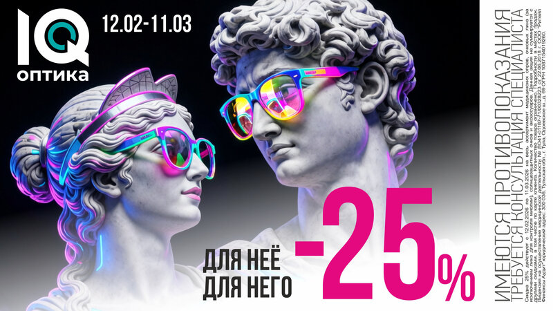 С 12.02. по 11.03.26 действует скидка - 25% на медицинские оправы и очковые линзы (за исключением линз контроля миопии), солнцезащитных очко...