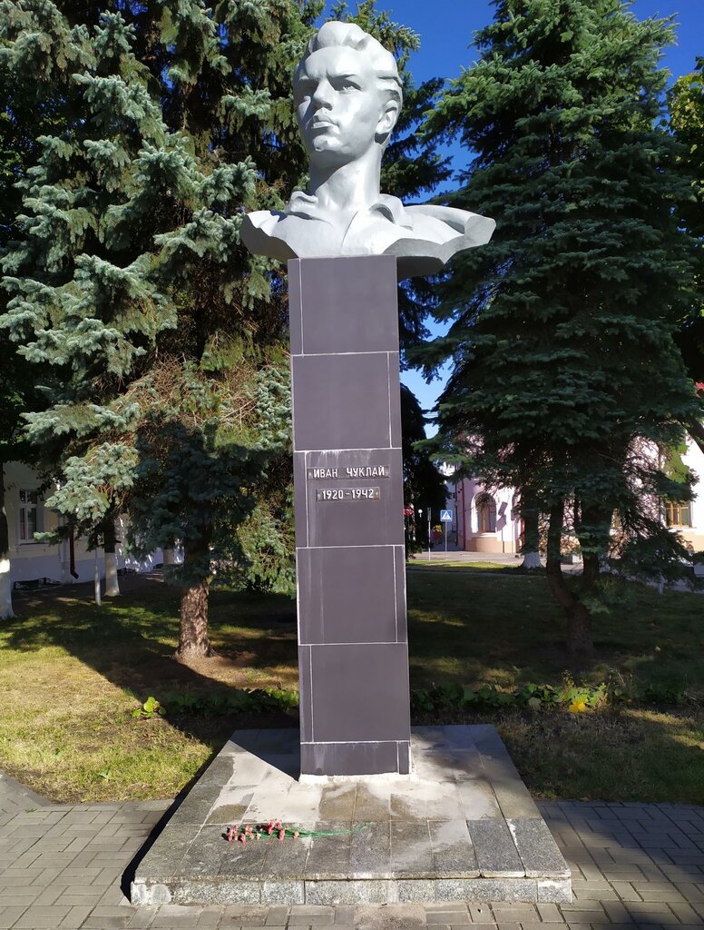 Ivan Ivanovich Chuklay was born in 1920 in the village of Prudniki, Vitebsk region. In 1940, he came to Pinsk, graduated from high school and worked as a senior pioneer leader. From the first days of the Great Patriotic War, Chuklay joined Vasily Korzh's fighter squad and participated in battles against the invaders in the summer of 1941. On July 8, 1941, he became a member of the underground Komsomol regional committee and was actively involved in organizing resistance. Ivan participated in sabotage, including the destruction of an enemy armored train and the blowing up of railway tracks. He showed exceptional courage and personal initiative in combat operations. On September 3, 1942, Chuklay died trying to rescue a wounded commissar. For his heroism, he was posthumously awarded the Order of Lenin, and his ashes were reburied in the mass grave of the liberators of Pinsk. His memory is immortalized in the name of Ivan Chuklay Street, and in 1984, a monument was erected at the intersection of Lenin and Zaslonov Streets, created by sculptor V. V. Poleychuk and architect A. A. Voskoley. The funds for its construction were collected by the youth and Komsomol members of the city. In 2015, the monument was reconstructed: the slabs were replaced with marble ones and the bust was updated.