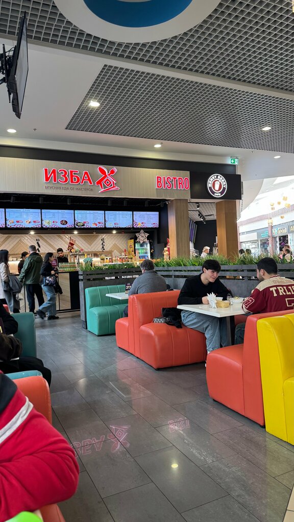 Находится в фуд коре. Выбор пал на суп гороховый (очень его люблю), вареники с вишней (тоже люблю)))! Обошлось все в 360 рублей, что очень демократично в наше время. Заказываешь на кассе садишься за любой стол и тебе через считанные минуты приносят все по мере готовки. Суп очень мне понравился, горох разварен, капценое мясо плавает в достаточном количестве, наваристый в общем. Вареники очень даже ничего, правда попалась косточка, хорошо что зуб не сломался, а то я от удовольствия так клацала зубами что могло бы закончится все плохо. Но что хочу сказать, сахара на минималках, я его даже не почувствовала, тонкое тесто и цельные не разваристая вишня. Ребята молодцы что за такую цену делаете прекрасный продукт!