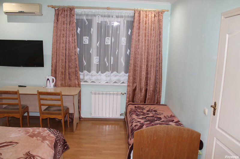 Гостиница последнего шанса(больше особо и нечего сказать. Час ночи дождь, перед этим 12 часов дороги и четыре часа на пункте пропуска Чонгар.Сил ехать уже не было,стали искатьгостиницу,всё было занято.Нашли Изумруд. В номере ощущение сырости,запах сырости ,прохладо, благо есть сплит система,включили на обогрев. Матрасы паролон наверное,вообще ни о чём гостиница.