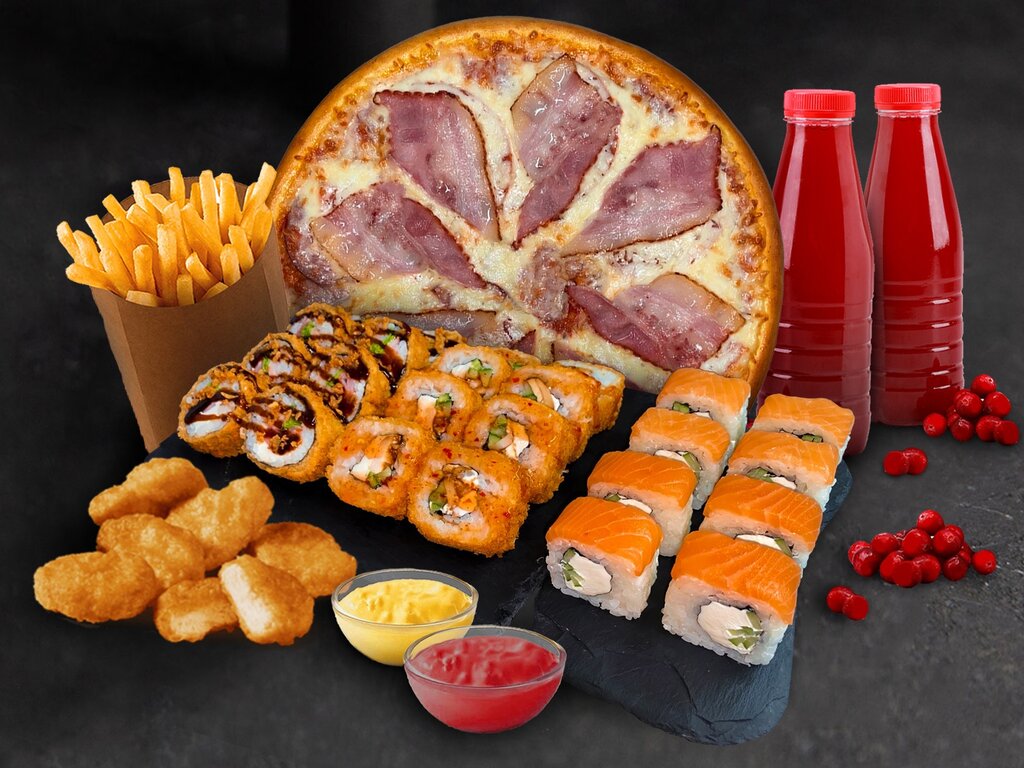 Variety of food:sushi and rolls, pizza