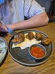 Перекусили замечательно, заказали шашлык куриный, креветки, розбив, детям гамбургер и картошку фри с наггетсами, порции не огромные но и не маленькие в целом достаточные чтобы досыта наесться, приготовили всё в течении 10-15 мин, блюда вкусные, сбалансированные, очень всё вкусно, атмосфера так же очень понравилась, особо беседки во дворе, дети так же порезвились на детской площадке